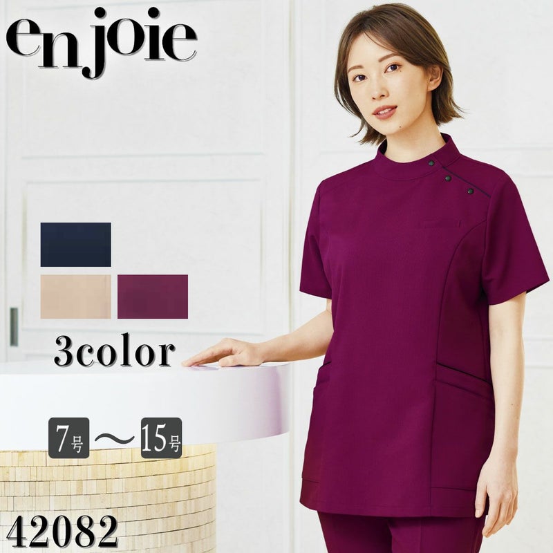 en joieが磨いてきたおもてなし服の美学をスクラブに落とし込み、ストレッチ性が高く軽やかな生地で、シンプルかつエレガントに仕立てました。新たに、はたらく女性に寄り添った脇のチラ見えを防止するケアマチ仕様のアイテムが登場いたしました。
